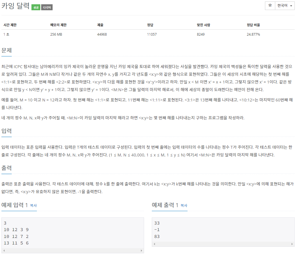 # x에 M을 계속 더해나간 값 = y에 N을 계속 더해나간 값 일때 정답 따라서 (x-y) % N == 0 이 성립해야 함