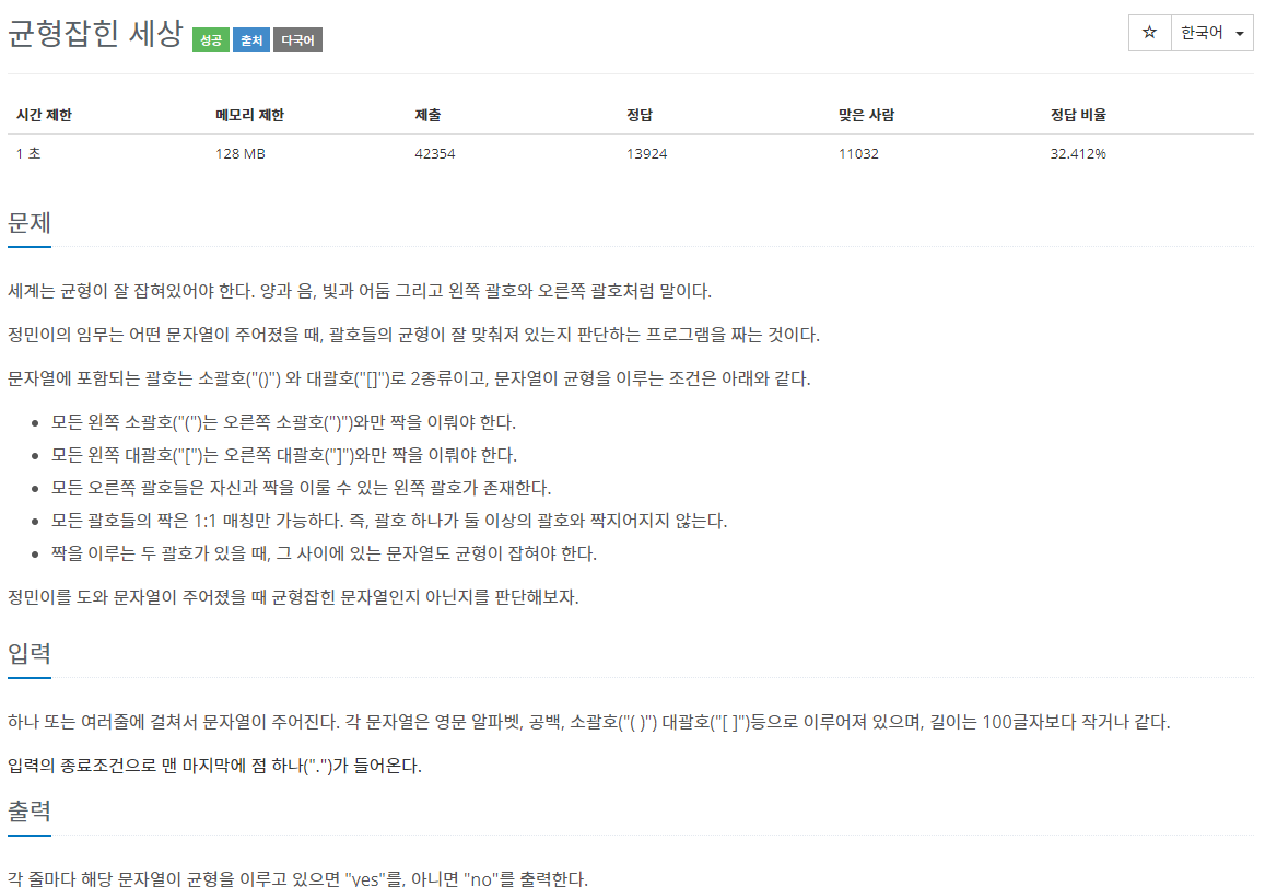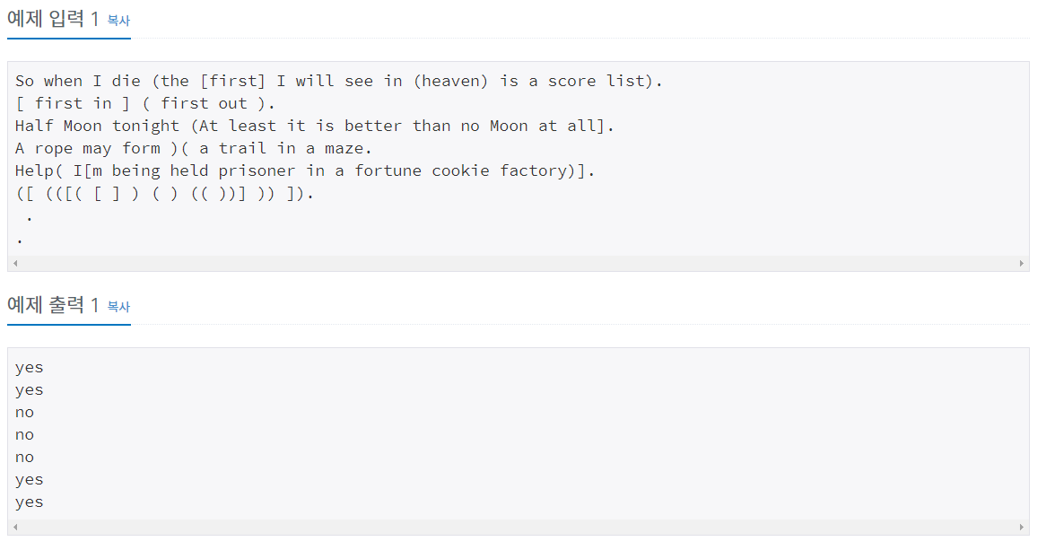 하나 또는 여러줄에 걸쳐서 문자열이 주어진다. 각 문자열은 영문 알파벳, 공백, 소괄호("( )") 대괄호("[ ]")등으로 이루어져 있으며, 길이는 100글자보다 작거나 같다. 입력의 종료조건으로 맨 마