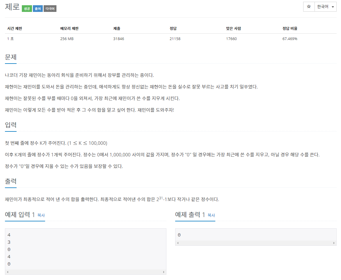 10773번: 제로